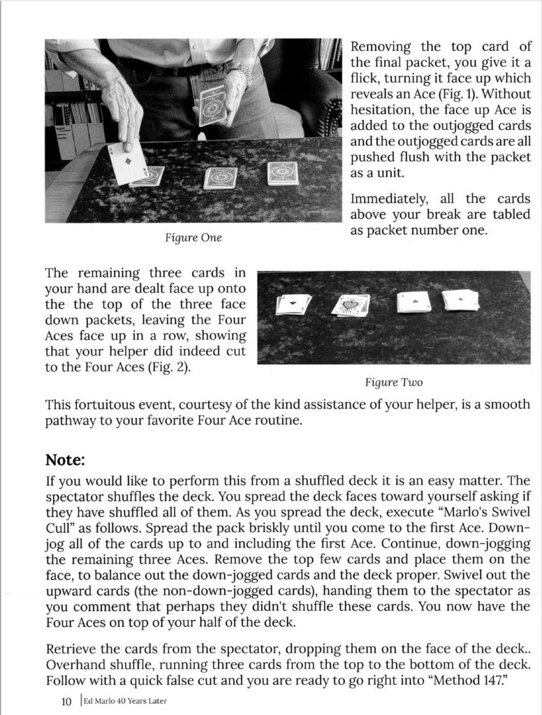“I fully realize that most cardicians don’t have a complete collection of Marlo’s creations (I don’t). That said, Ed Marlo Forty Years Later offers those interested in pursing the fine art of card magic the opportunity to take a deep dive into Marlo’s world. I’ve been a huge fan of Ed Marlo’s card magic for most of my adult life (still am), and he was the most prolific cardician to ever pick up a deck of cards. I highly recommend this wonderful publication.”