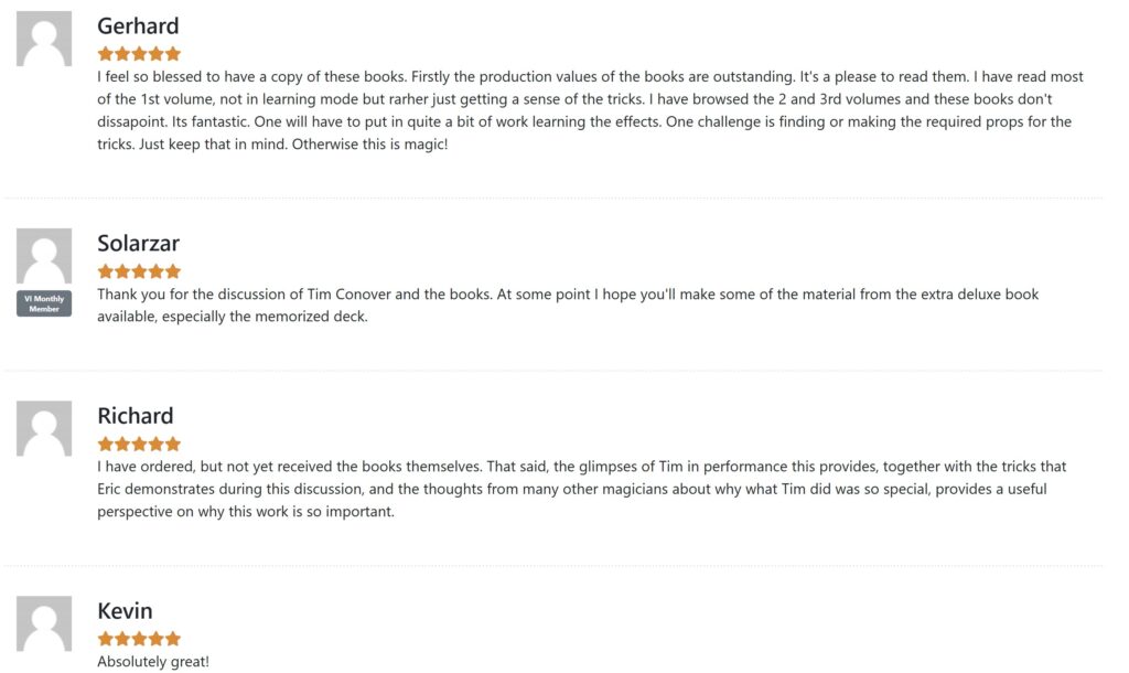 Conover is a legacy of a magician who left us too soon. Throughout the books are countless stories from friends and family about him. Reading these stories gives you a glimpse into Tim, his character, and, of course, the way he viewed magic.