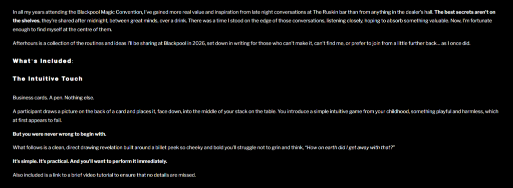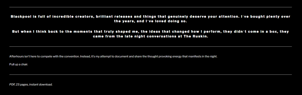 Afterhours documents the thinking, structure and “why didn’t I think of that?” material shared in late-night conversations that unfold once the dealer’s hall closes.
