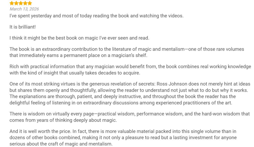 Lior Manor: “Ross Johnson is a legend. The world of mentalism is receiving a huge gift with this book, as Ross reveals all the methods and philosophical aspects that have made his shows a success for decades.”