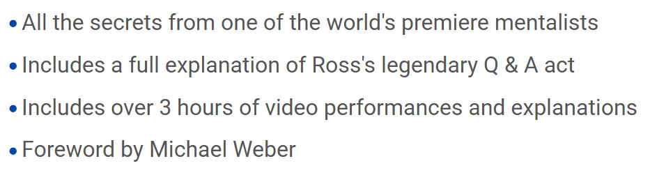 Jeff and Tessa Evason: “Ross is a true luminary in the world of mentalism. For decades, he has inspired us—not only with his brilliant performances, but with his deep thinking and masterful approach to the craft. It’s incredibly rare for a professional performer of Ross’s stature to share material he has polished over a lifetime on stage. This book is a treasure trove, and we feel so fortunate to have access to it. For any serious student of mentalism, this is a huge gift.”