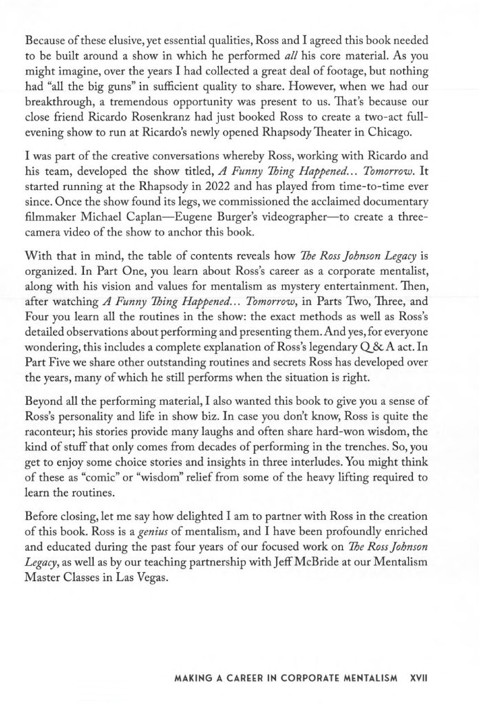 Craig Karges: “Ross Johnson and his shows for ‘real’ people are legend. Ross has long represented the quintessential mentalist. In this legacy book you get strong performance pieces but also insight on what it takes to do real shows for real people for real money year-after-year and decade-after-decade.”