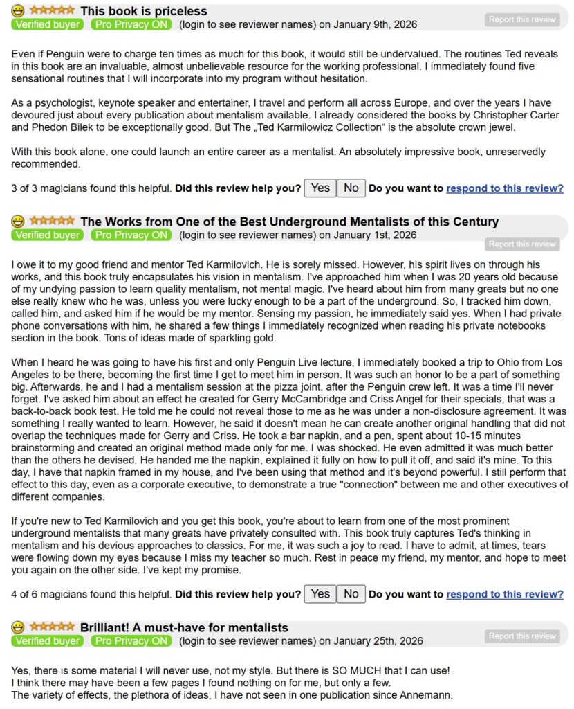 “It’s hard to find a less-likely household name than Karmilovich. (And the fact is, to the public he was always Ted Saint James). But to well-posted members in the world of mentalism, he is a legend. And while I wish he could have seen the reception of his long-awaited magnum opus, I know his legend will live on through generations of performers as a result of this masterwork.” – Neil Tobin
